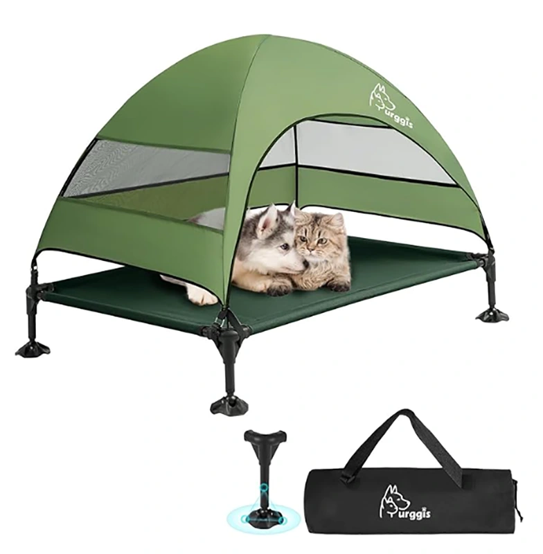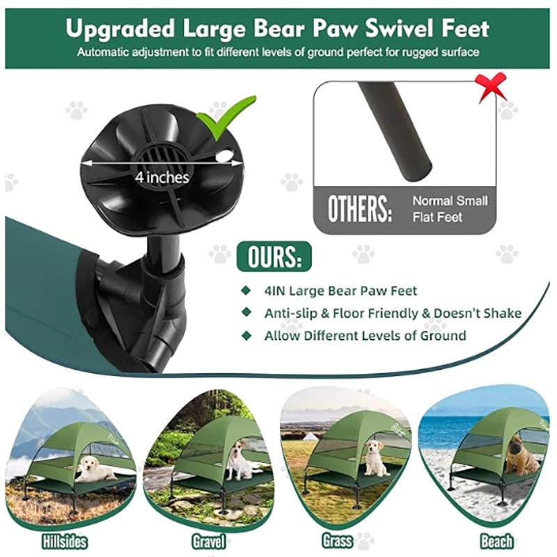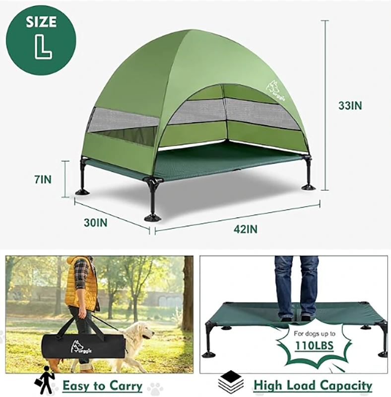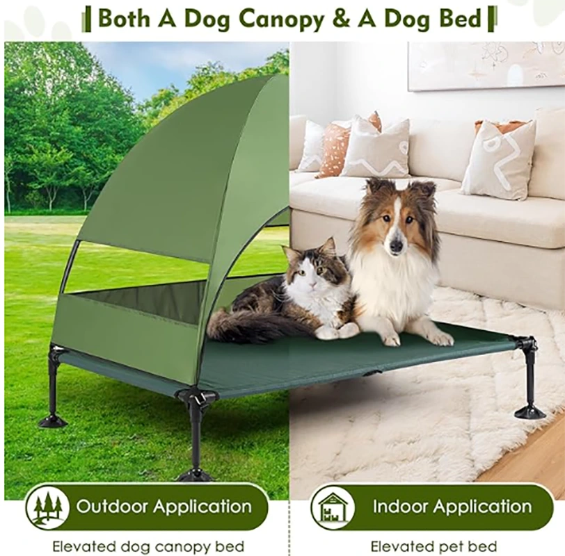 Kattahundarúm með tjaldhiminn, Uppfært upphækkað hundarúm með tjaldhimni, færanlegt upphækkað útihundarúm með stöðugum hálkufótum, breiðari skugga gæludýrarúm, upphækkuð hundarúm fyrir stóra hunda, tjaldsvæði, inni og úti.