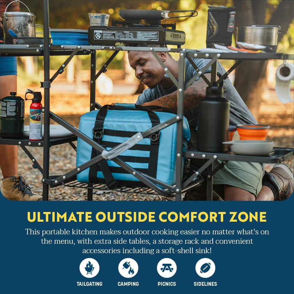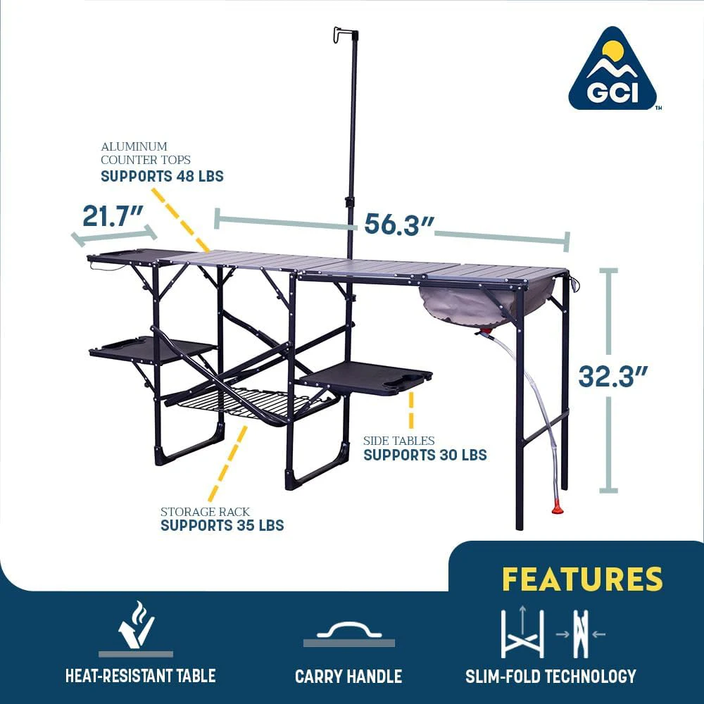 Færanlegt samanbrjótanlegt ál tjaldstæði, gerðu búðirnar þínar epískar með Master Cook stöðinni frá GCI Outdoor. Þetta flytjanlega eldhús er pakkað með eiginleikum (þ.mt mjúku skelvasi!), Sem gerir það að fullkominni viðbót við skottið þitt eða útilegu nauðsynjar.