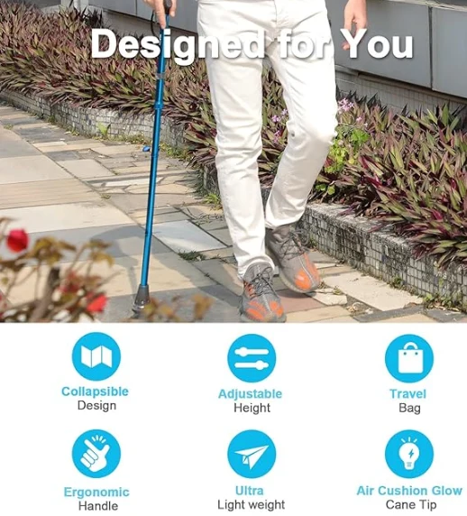 Fellible Telescopic Walking Cane. Öll hugsi hönnun gerir burðar og geymslu engan höfuðverk lengur..Zhejiang Jiayu Outdoor Products Co., Ltd., Tructure gleypir áföll og dempar áhrifin á liðina og vöðvana frá áföllum. Allt grunnkerfið hámarkar öryggi daglega hreyfanleika.